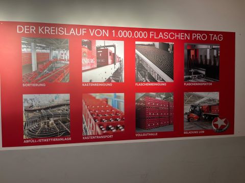 Besonders eindrucksvoll war anschließend der Bereich der Abfüllung. Wir konnten den gesamten Abfüll-, Reinigungs- und Wiederbefüllungsprozess live mitverfolgen – von den benutzten Flaschen über deren gründliche Reinigung bis hin zum erneuten Befüllen. Dabei wurde deutlich, wie schnell, präzise und effizient dieser Ablauf organisiert ist.
